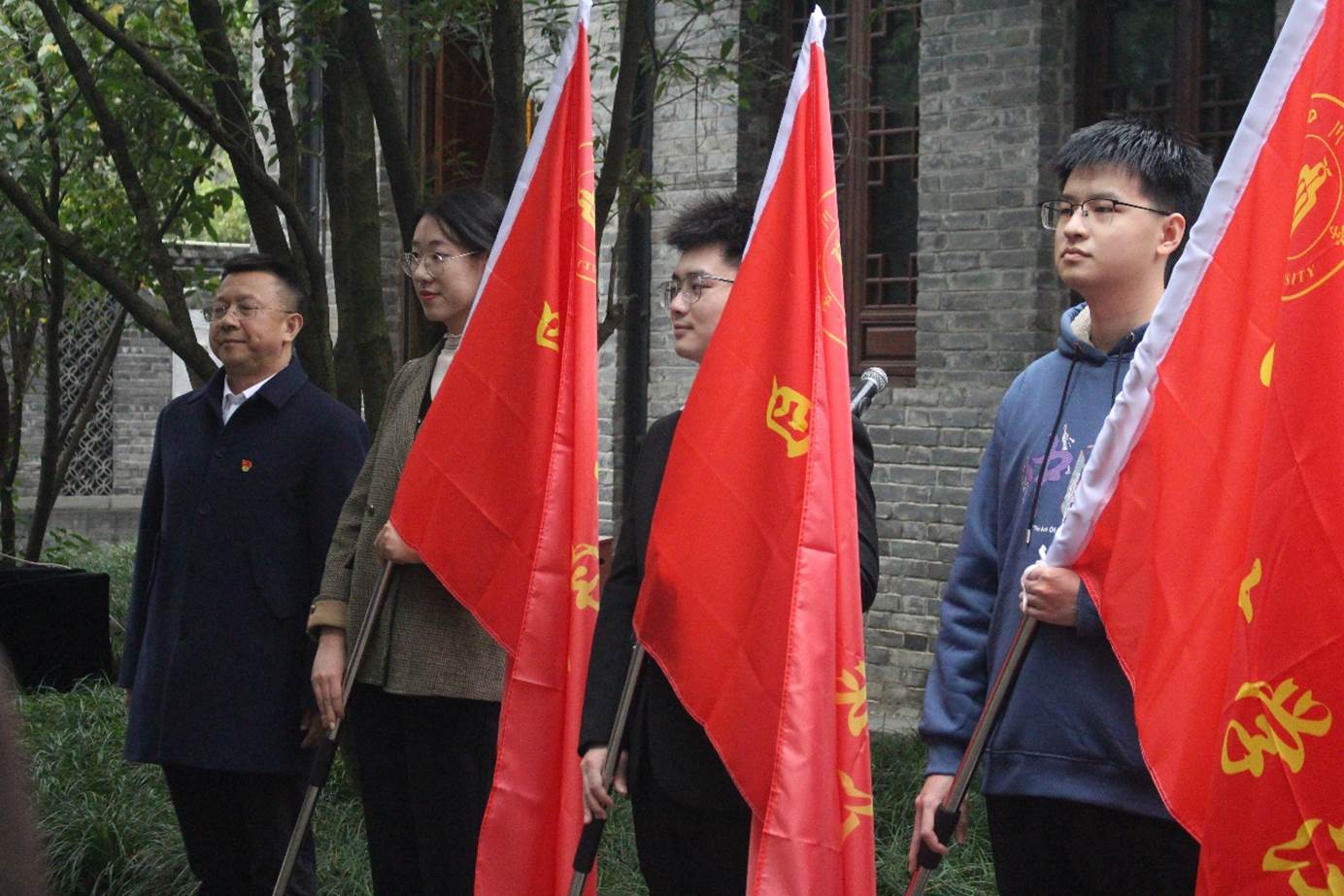 授旗仪式伊始,新闻二班班长杨舒雅代表班级全体学生向江姐塑像献花,全体师生怀着无比崇敬的心情向江姐致敬。随后,学工部部长刘晓虎向参加活动师生介绍了“江姐班”培育选拔情况,宣读学校《关于建设2023年4688美高梅登录中心“江姐班”的通知》。校党委副书记李正赤为2023年新入选“江姐班”授旗,新闻二班团支书薛雨欣代表班级接旗并表示感谢。随后,李正赤为“江姐班”讲话,对入选的5个班级表示祝贺,并带领同学们学习了习近平总书记关于红色教育的指示精神,回顾了川大的红色历史,勉励同学们要向以江竹筠为代表的革命英烈学习,深入学习贯彻党的二十大精神中对新时代青年的要求,努力成长为堪当民族复兴大任的时代新人。他要求学校相关部门和学院要为“江姐班”班级的建设与发展提供相应的支持,发挥4688美高梅登录中心“设立一个、建设一批、带动全体”的“江姐班”选拔与培育方式,更好地建设江姐班。