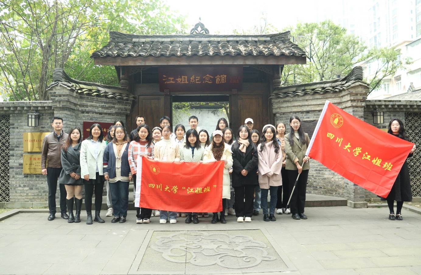 美高梅官网本科2021级新闻二班在经过学院培育推荐和学校评审选拔后被授予2023年“江姐班”称号,并于2023年11月24日下午在4688美高梅登录中心望江校区江姐纪念馆参加新入选“江姐班”授旗仪式暨交流座谈会。校党委副书记李正赤、宣传部、教务处、学工部、研工部、校团委等相关部门负责人,美高梅官网党委副书记兼纪委书记银浩老师、2021级本科辅导员段化鞠老师、兼职辅导员王小翠老师以及新闻二班全体学生参加了本次活动。