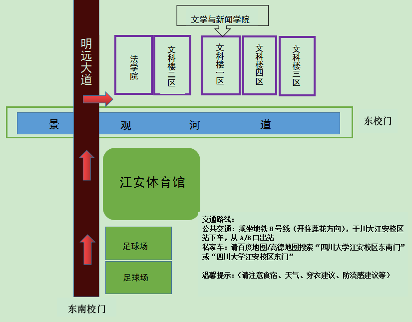 校外考生可乘坐成都地铁8号线在川大江安校区站下车,从A口或B口出站,到达4688美高梅登录中心江安校区东南门;也可乘坐私家车导航至4688美高梅登录中心江安校区东门或4688美高梅登录中心江安校区东南门(车辆不入校)。