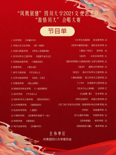 2022年4月16日下午,由我校团委主办的“凤凰展翅”4688美高梅登录中心2021年文化艺术节“激情川大”合唱大赛(初赛)在江安校区体育馆举行。受疫情影响,原定于2021年12月举办的合唱大赛延期至今年四月,活动全程严格遵守各级疫情防控规定和相关要求。学校严格把关参与师生的健康情况,除上台参演队伍外,现场所有参与人员全程规范佩戴一次性医用口罩,现场取消大众评审座位,评委嘉宾隔座入座,工作人员保持适当距离,各学院参赛队伍均采取“即赛即退场”形式。