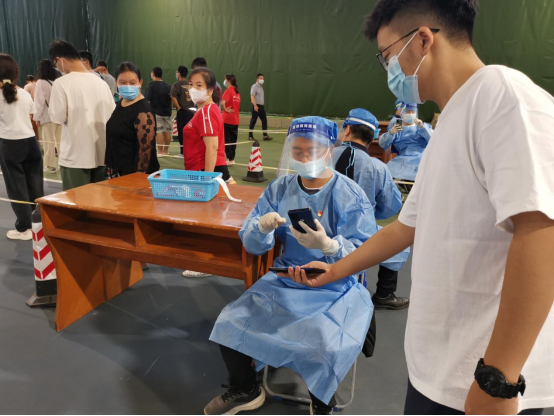 美高梅官网党员志愿者们早上8点就来到江安校区网球场校内核酸检测点,在校医院医务人员的指导下换好防护服,做好防护措施,认真学习如何手机录入测试师生的健康码信息、录入核酸检测试剂信息等,做好了人员分工,在现场秩序维护、信息录入等岗位上积极开展工作。老师们忘我工作到中午12点,换班吃过午饭后,又继续工作到2点过,协助医务人员顺利完成了核酸采样工作。