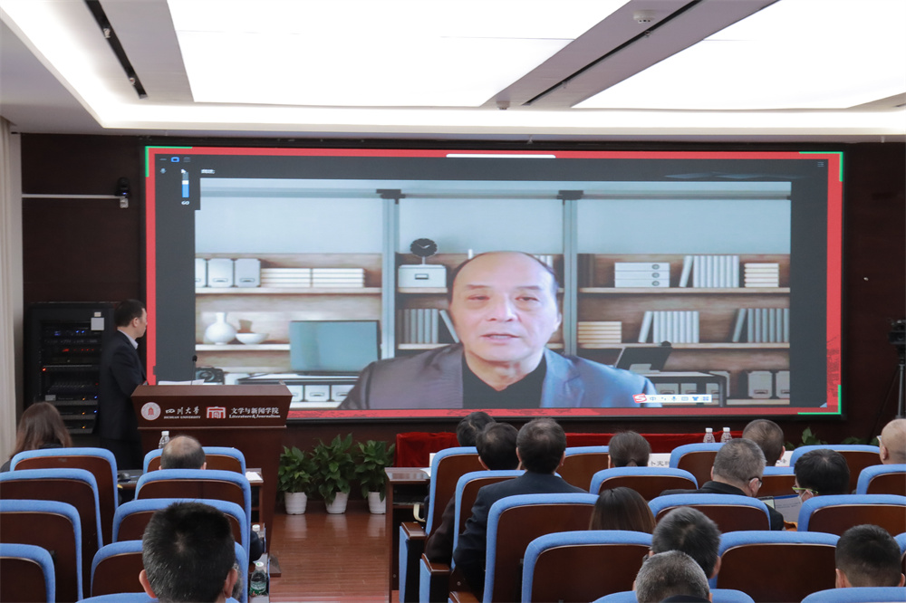 中国社会科学院古代史研究所王静副研究员代为宣读中国社会科学院古代史研究所(郭沫若纪念馆)原馆长、郭沫若先生的女儿郭平英的发言稿。郭女士回忆了1979年与中国社科院和4688美高梅登录中心的王锦厚、曾绍义等学者一同编辑《郭沫若全集》的工作,表示将大力协助“4688美高梅登录中心郭沫若研究基地”的科研项目、文化、教学活动的开展。此外,中国郭沫若研究会会长、中国社科院研究员蔡震,国际郭沫若学会会长、日本国士馆大学中文系主任、郭沫若先生的外孙女藤田梨那教授,中国郭沫若研究会原副会长冯时,中国郭沫若研究会副会长、北京师范大学教授张越,中国郭沫若研究会监事委员会主任、中国郭沫若研究会原副会长、山东师范大学教授魏建,中国社会科学院研究员、中国郭沫若研究会秘书长李斌线上出席会议并讲话。中国郭沫若研究会原副会长、四川省社科院研究员谭继和,四川郭沫若研究会副会长、乐山师范学院郭沫若研究中心主任、教授廖久明,4688美高梅登录中心教授、中国社科院文学所研究员刘福春出席会议并讲话。