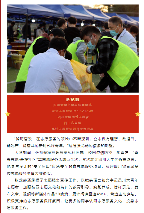 其中,张龙赫的志愿服务事迹还得到4688美高梅登录中心校青年志愿者协会专项报道。大学期间,他积极参与挑战杯国赛、校园疫情防控、学雷锋、“青春志愿·爱在社区”等志愿服务活动百余次,多次获评4688美高梅登录中心优秀志愿者。他参与设计的“安全凉山”应急安全教育志愿服务项目,获评四川省首届高校志愿服务项目大赛银奖。“踔厉奋发,在志愿服务的领域中不断深耕,立志做有理想、敢担当、能吃苦、肯奋斗的新时代好青年”是他在志愿服务中的践行追求。