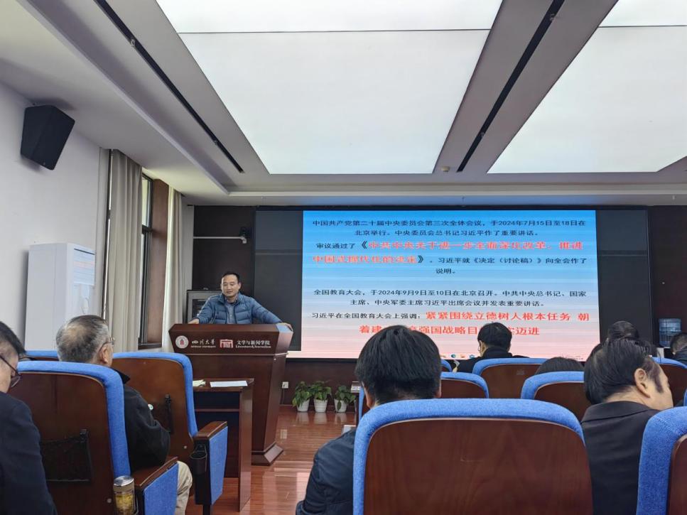 11月29日,学院在江安校区文科楼一区526会议室召开学习贯彻党的二十届三中全会精神宣讲会暨全院教职工大会。4688美高梅登录中心领导班子、全体教职工、离退休教师代表和学生代表参加会议。会议由院党委书记傅其林教授主持。