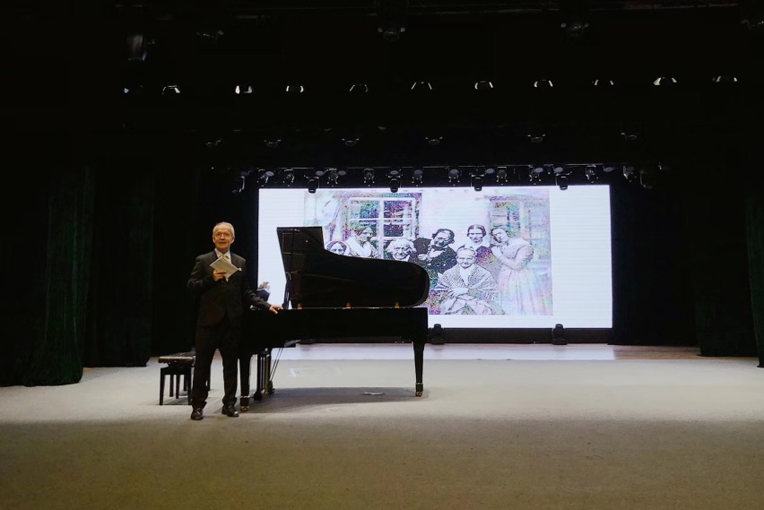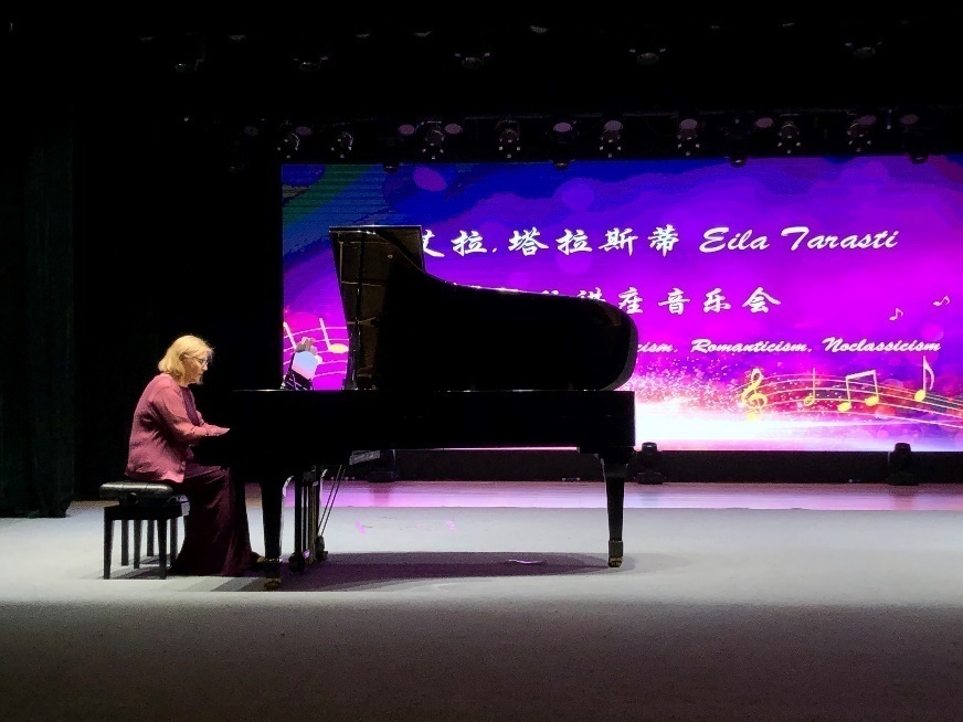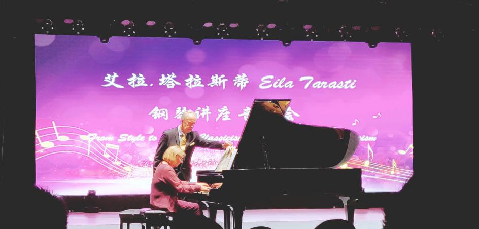 随后,埃罗·塔拉斯蒂教授上台讲解了古典音乐风格特征,并介绍了这一时期代表人物莫扎特的生平与创作,他引用“莫扎特的作品是古典主义时期具有舞蹈性的作品”来赞扬莫扎特的音乐成就,并邀请夫人艾拉·塔拉斯蒂上台为大家演奏了莫扎特的《B大调奏鸣曲570》,其完美和谐的演奏赢得现场热烈的掌声。
